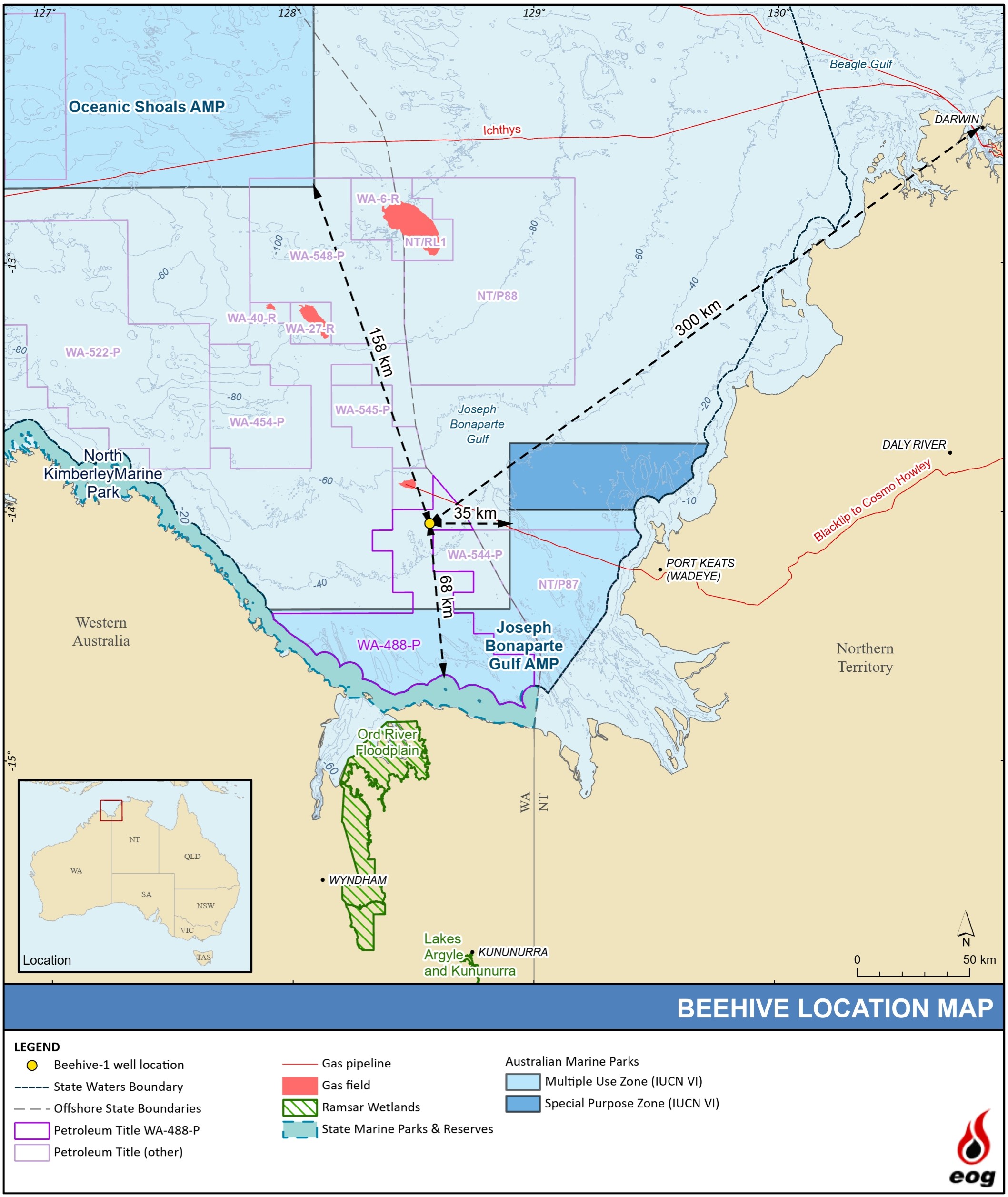 EOG proposes to drill the Beehive-1 exploration well, situated in a water depth of 40 m and located 80 km off the WA coastline and 300 km southwest of Darwin in the Northern Territory. In accordance with the accepted environmental plan, the Drilling Activity may commence no earlier than January 2024 and if commenced will be completed no later than December 2025 and would be expected to take between 55 and 100 days. A 500 m Petroleum Safety Zone will be established around the well for the duration of the drilling program.
